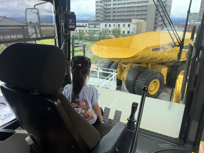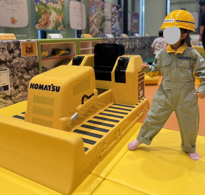 同じ敷地内にある屋内施設「わくわくコマツ館」では、子どもがコマツの制服を着て“なりきり運転士”になれます。