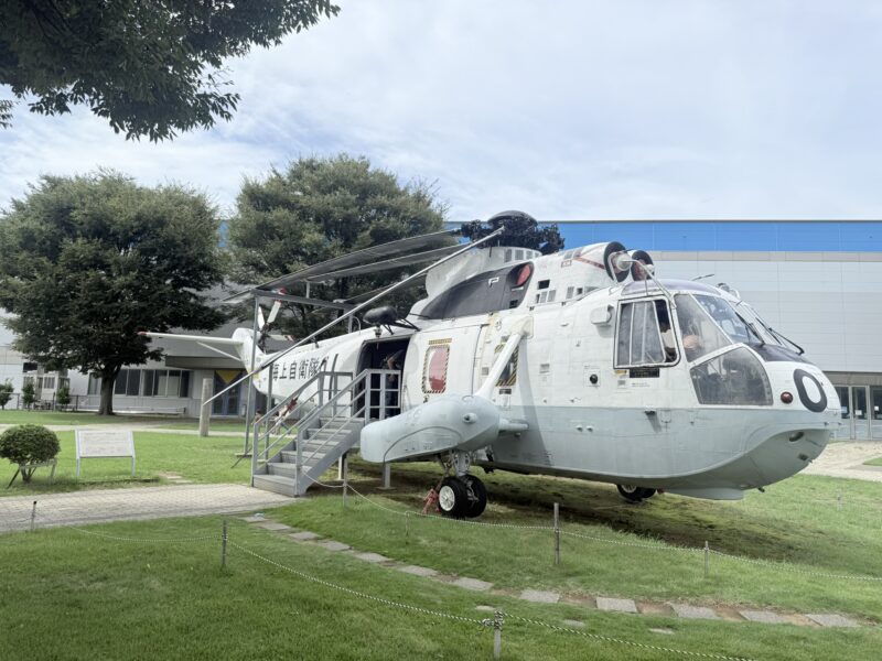 建物の前には、自衛隊の本物のヘリコプターが展示されていて、