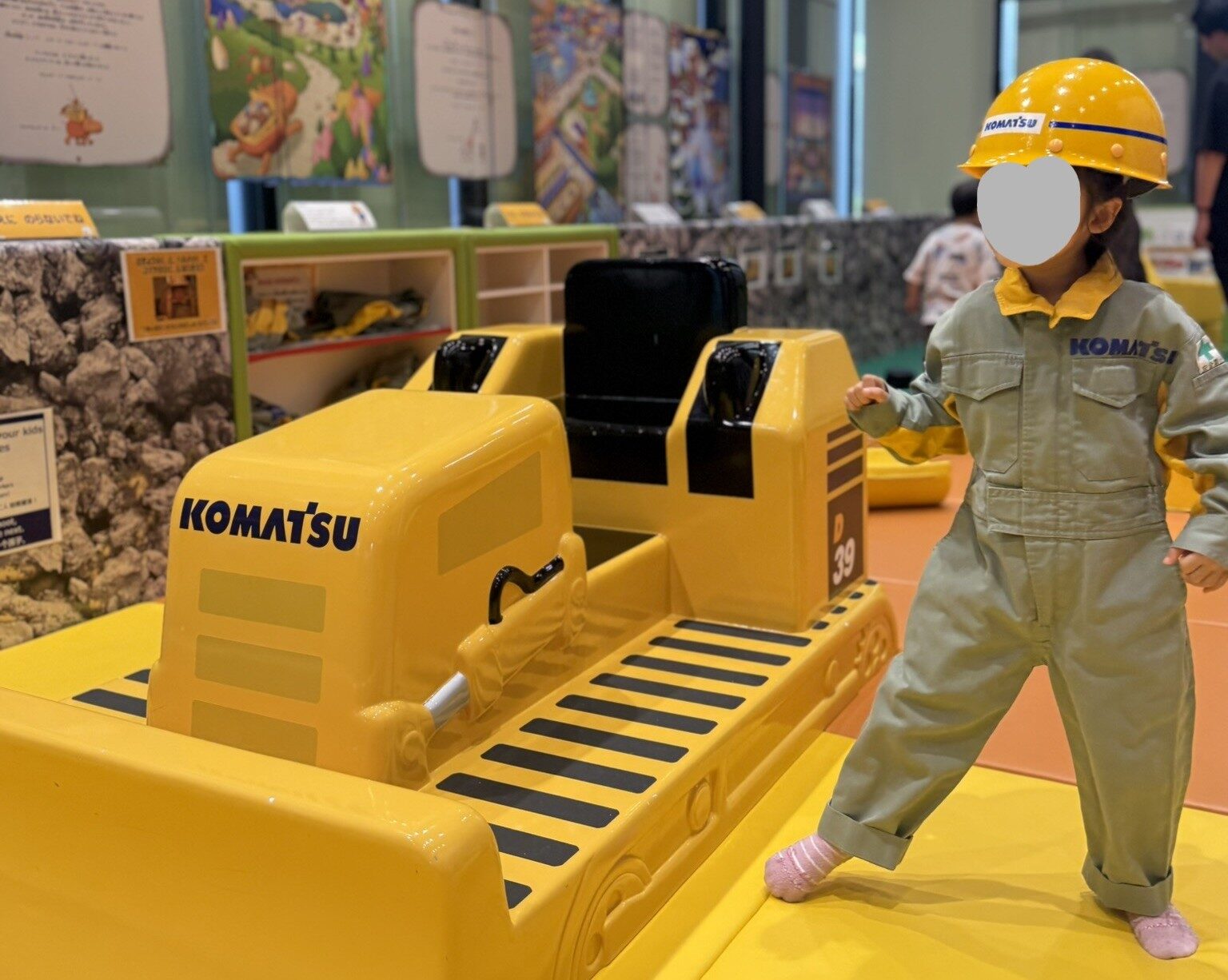 同じ敷地内にある屋内施設「わくわくコマツ館」では、子どもがコマツの制服を着て“なりきり運転士”になれます。